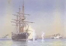 La Covadonga empezó a hacer fuego sobre la embarcación, que aunque inmóvil, mantenía su bandera a tope, signo de que se mantenía el combate.